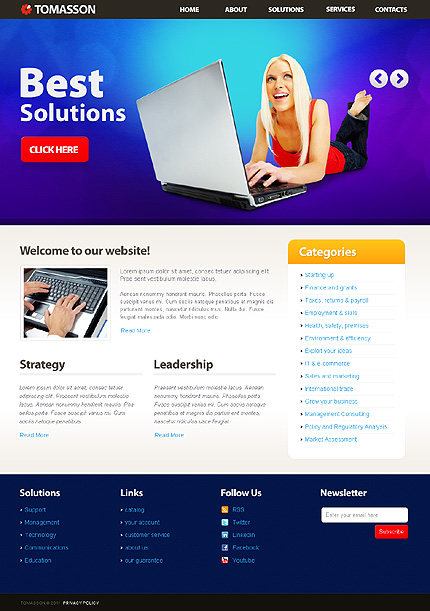 Dostosowanie strony www:W ramach usługi domyślne logo szablonu zostanie zastąpione Twoją nazwą lub zostanie wstawione logo dostarczone w pliku PSD lub AI. Nazwy przycisków menu nawigacyjnego strony zostaną zastąpione wybranymi przez Ciebie nazwami podstron. Wymienione zostaną teksty, zdjęcia i linki strony głównej oraz do 6 dowolnych podstron serwisu. Nie będą wymieniane schematy kolorystyczne oraz układ strony. Strona zostanie zainstalowana na wskazanym serwerze bez systemu zarządzania treścią CMS. System CMS należy zamówić oddzielnie.