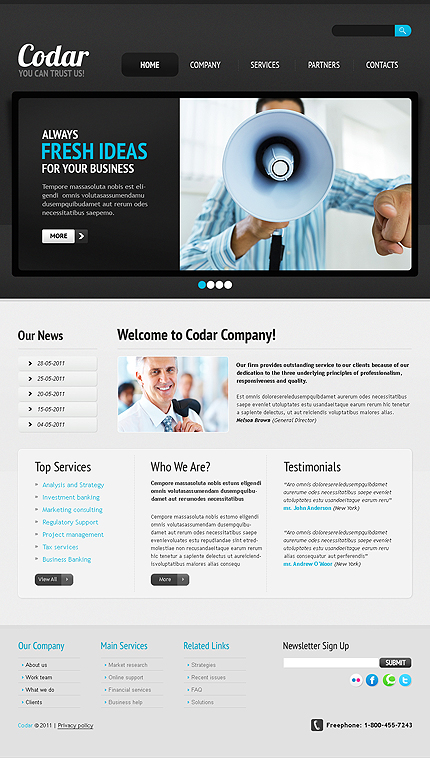 Dostosowanie strony www:W ramach usługi domyślne logo szablonu zostanie zastąpione Twoją nazwą lub zostanie wstawione logo dostarczone w pliku PSD lub AI. Nazwy przycisków menu nawigacyjnego strony zostaną zastąpione wybranymi przez Ciebie nazwami podstron. Wymienione zostaną teksty, zdjęcia i linki strony głównej oraz do 6 dowolnych podstron serwisu. Nie będą wymieniane schematy kolorystyczne oraz układ strony. Strona zostanie zainstalowana na wskazanym serwerze bez systemu zarządzania treścią CMS. System CMS należy zamówić oddzielnie.