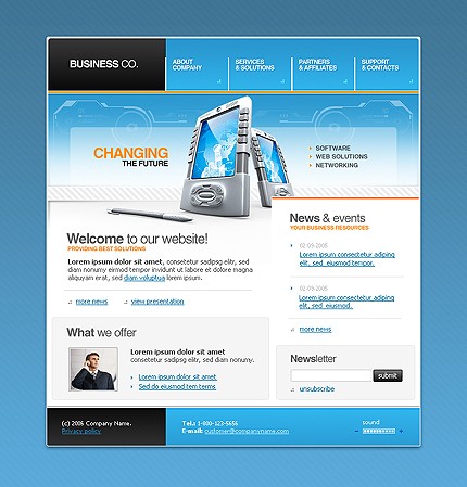 W ramach usługi domyślne logo szablonu zostanie zastąpione Twoją nazwą lub zostanie wstawione logo dostarczone w pliku PSD lub AI. Nazwy przycisków menu nawigacyjnego strony zostaną zastąpione wybranymi przez Ciebie nazwami podstron. Wymienione zostaną teksty, zdjęcia i linki strony głównej oraz do 6 dowolnych podstron serwisu. Nie będą wymieniane schematy kolorystyczne oraz układ strony. Strona zostanie zainstalowana na wskazanym serwerze bez systemu zarządzania treścią CMS. System CMS należy zamówić oddzielnie.